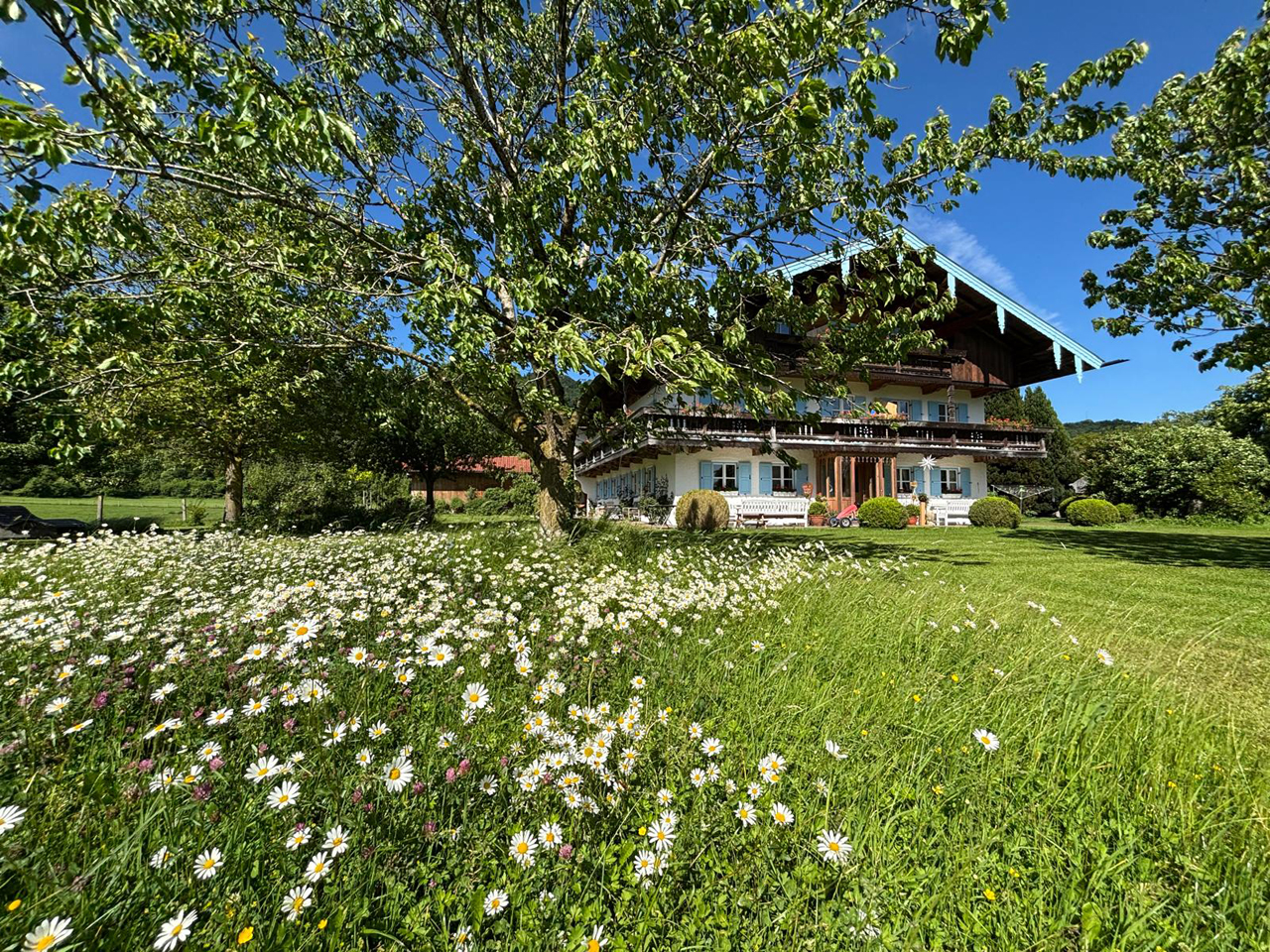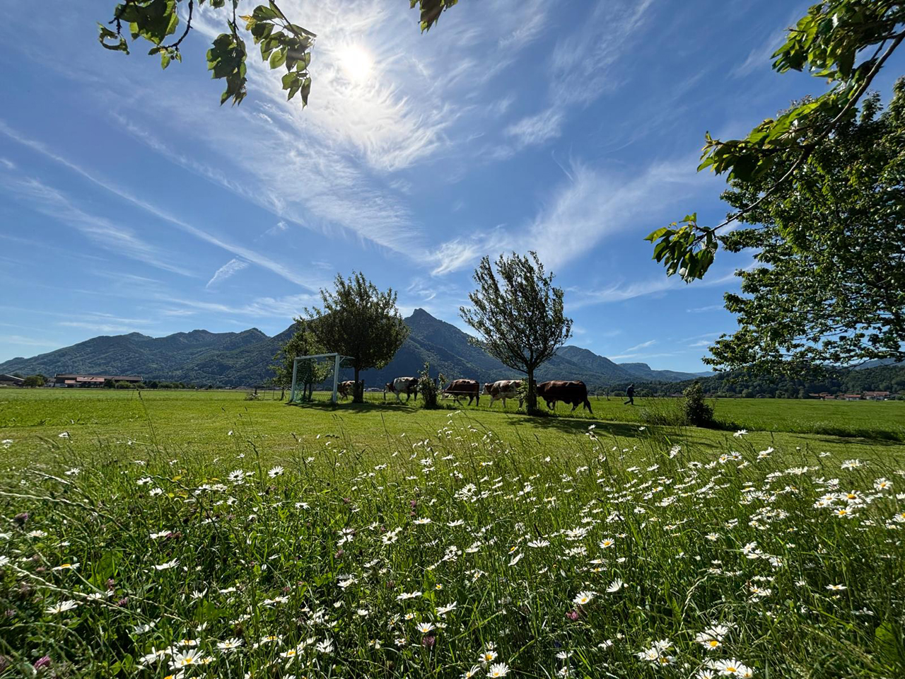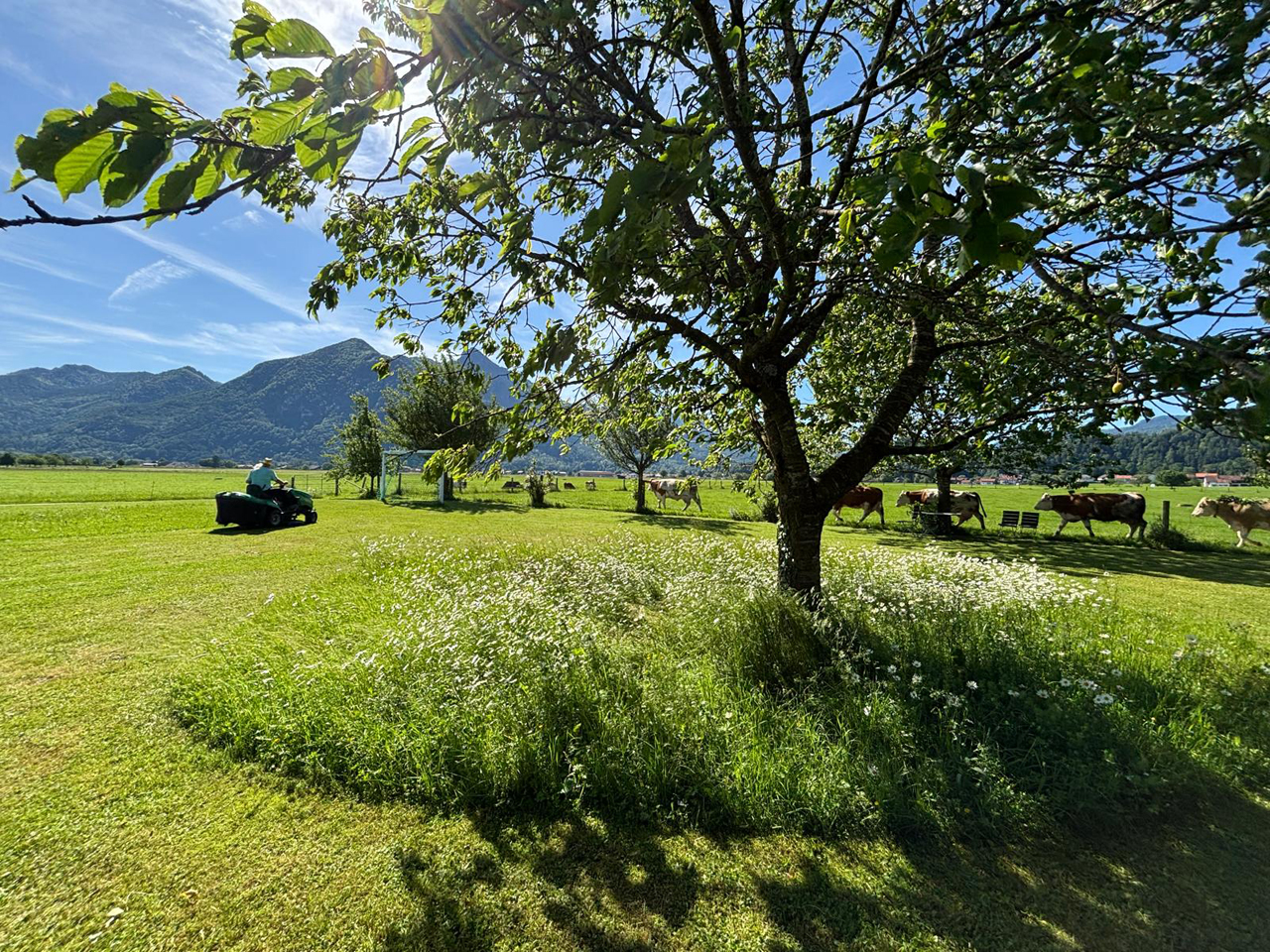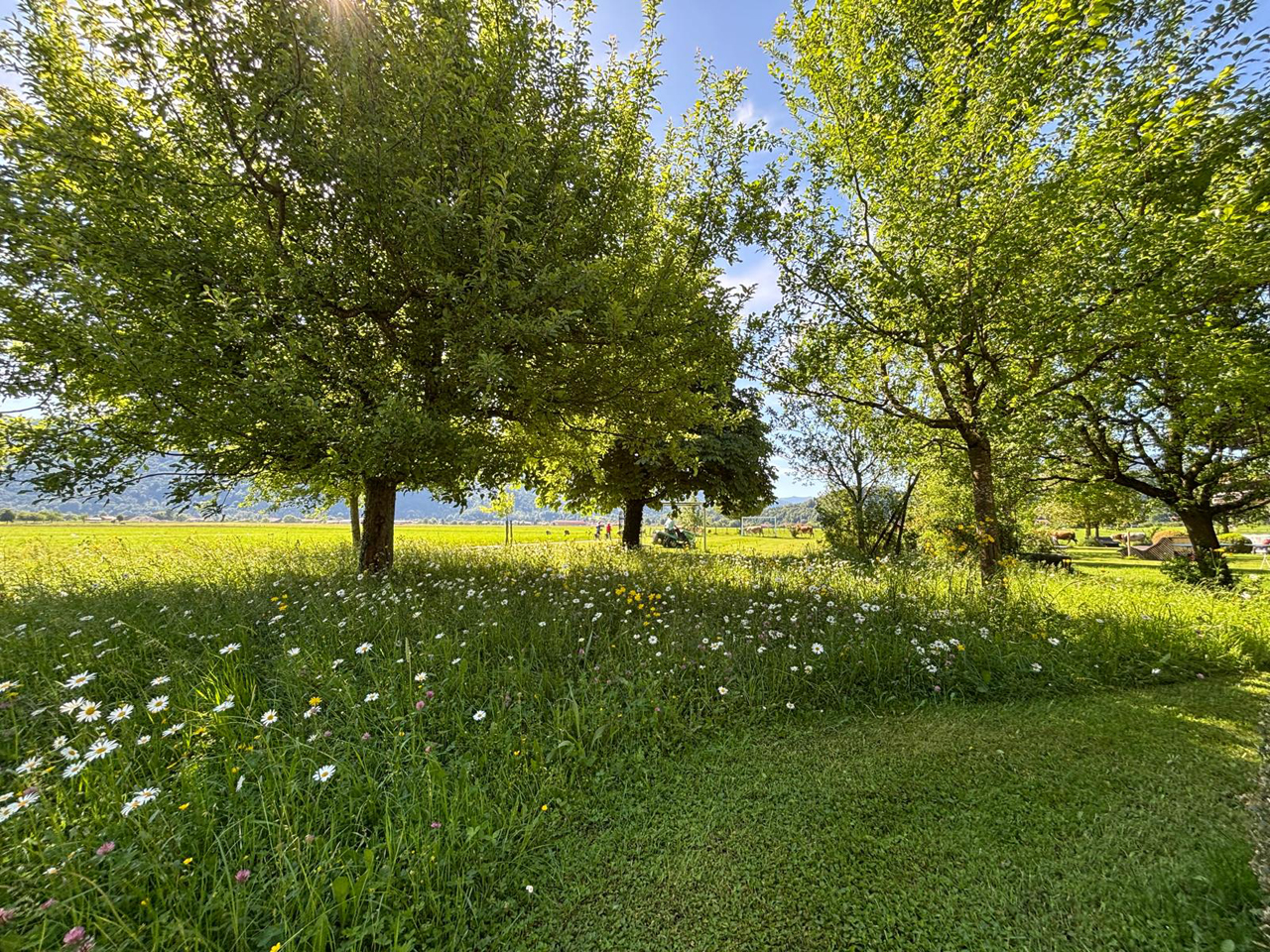 Im Frühling haben wir bewusst Teile unserer Wiese wachsen lassen – Margeriten, Rotklee, Wiesen‑Pippau und viele bunte Blumen sorgen nun für ein echtes Summ‑Summ‑Paradies. Die Bienen freuen sich über jede Blüte, und wir genießen das bunte Blütenmeer und die friedliche Atmosphäre bei unseren Spaziergängen.