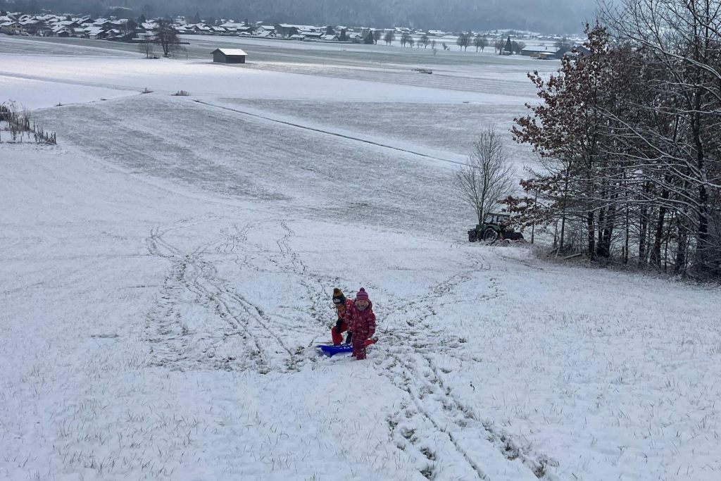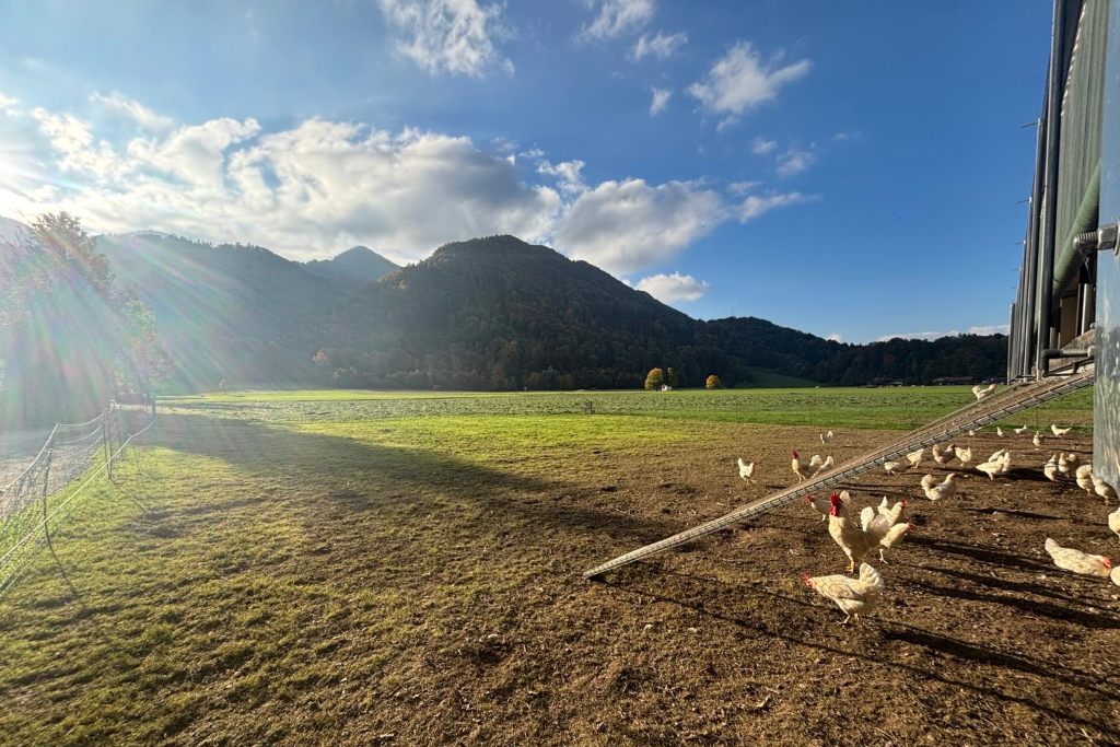 Der Duft von frisch gemähtem Gras, Kinderlachen auf dem Trampolin, Grillabende im Garten und laue Stunden auf der Terrasse, wenn die Berge im Abendlicht leuchten. Mit der Chiemgau Card sorgten wir für unbeschwerten Badespaß, während unsere Junghennen neugierig den Hof erkundeten – begleitet vom neuen Design unserer Bio BergEier (erhältlich im Hofladen, jetzt auch mit Kartenzahlung). Die Heuernte wurde wieder zur Familienzeit: draußen sein, gemeinsam anpacken, Natur erleben. Und auch unsere kleinen Gäste waren heuer wieder ein fester Teil des Hoflebens. Ob im Stall, beim Füttern, Melken oder Ernten – mit eigener Stall-Latzhose durften sie mithelfen, toben und lernen, wo unsere Lebensmittel herkommen. Genau das macht Urlaub auf dem Bauernhof so besonders.